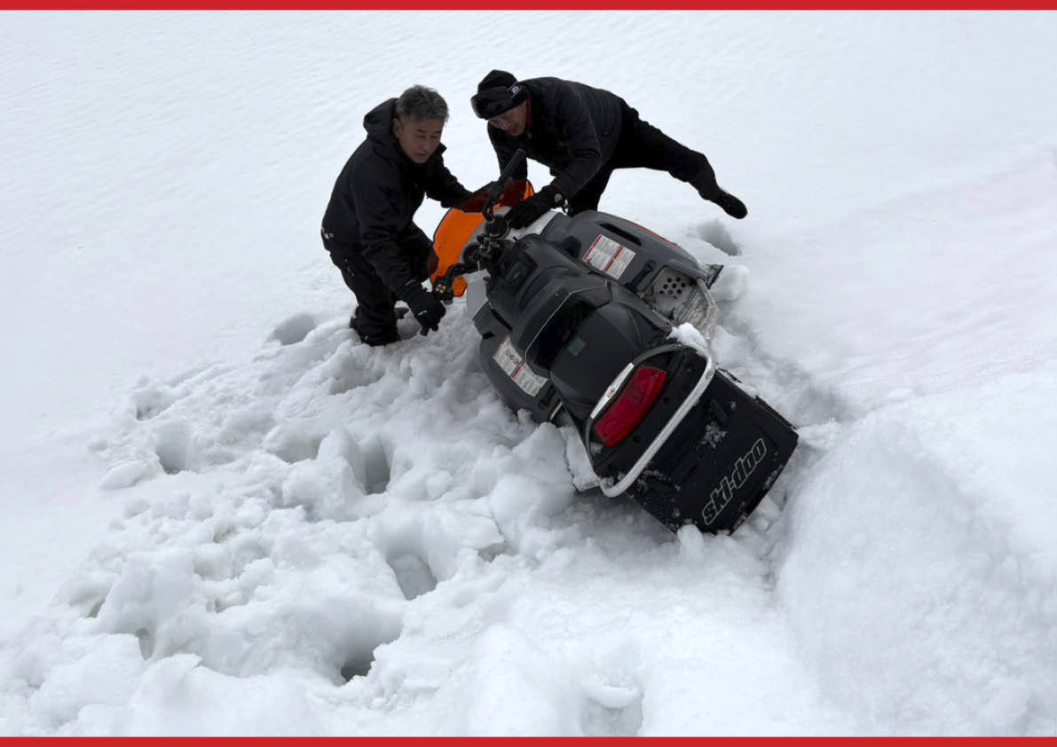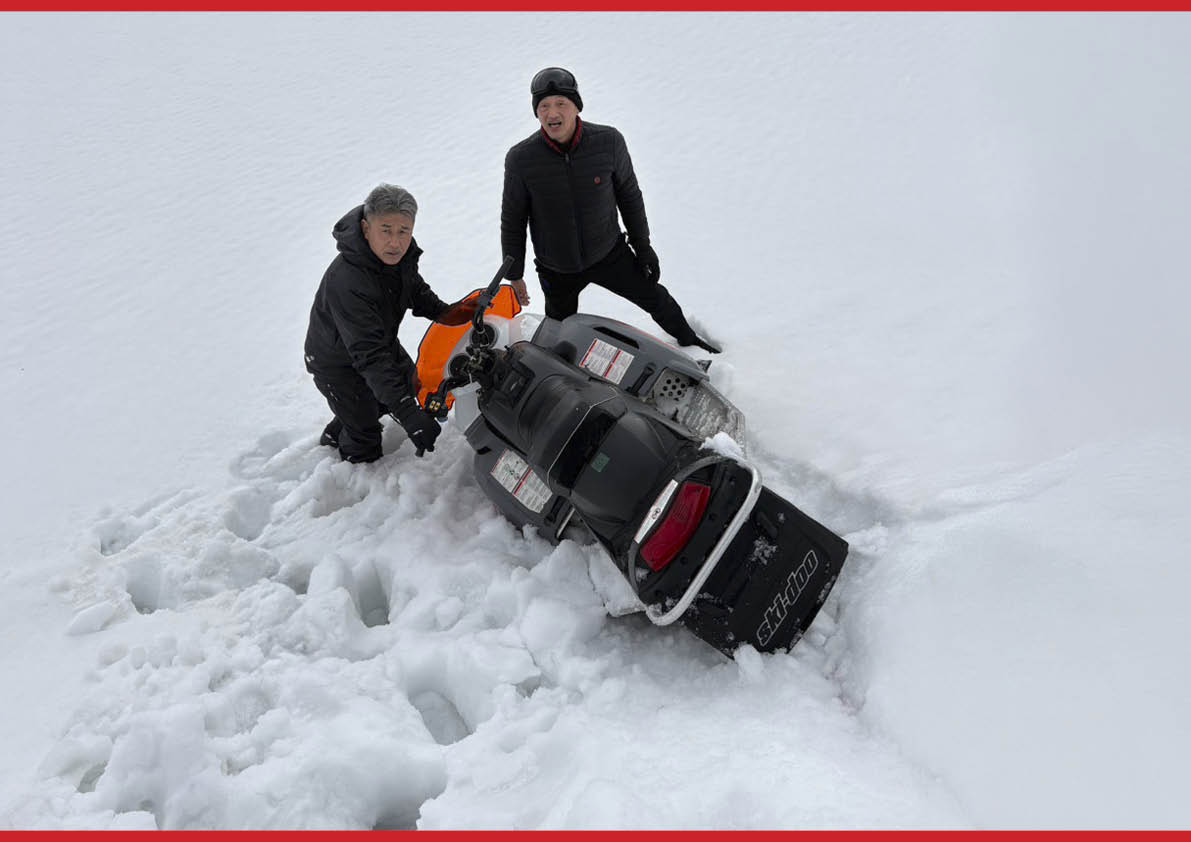 前回 この雪山で スノーモービルを 体験させていただいたとき、雪で“埋まって”しまった スノーモービルを 掘り出すのに 苦労した 記憶がある。