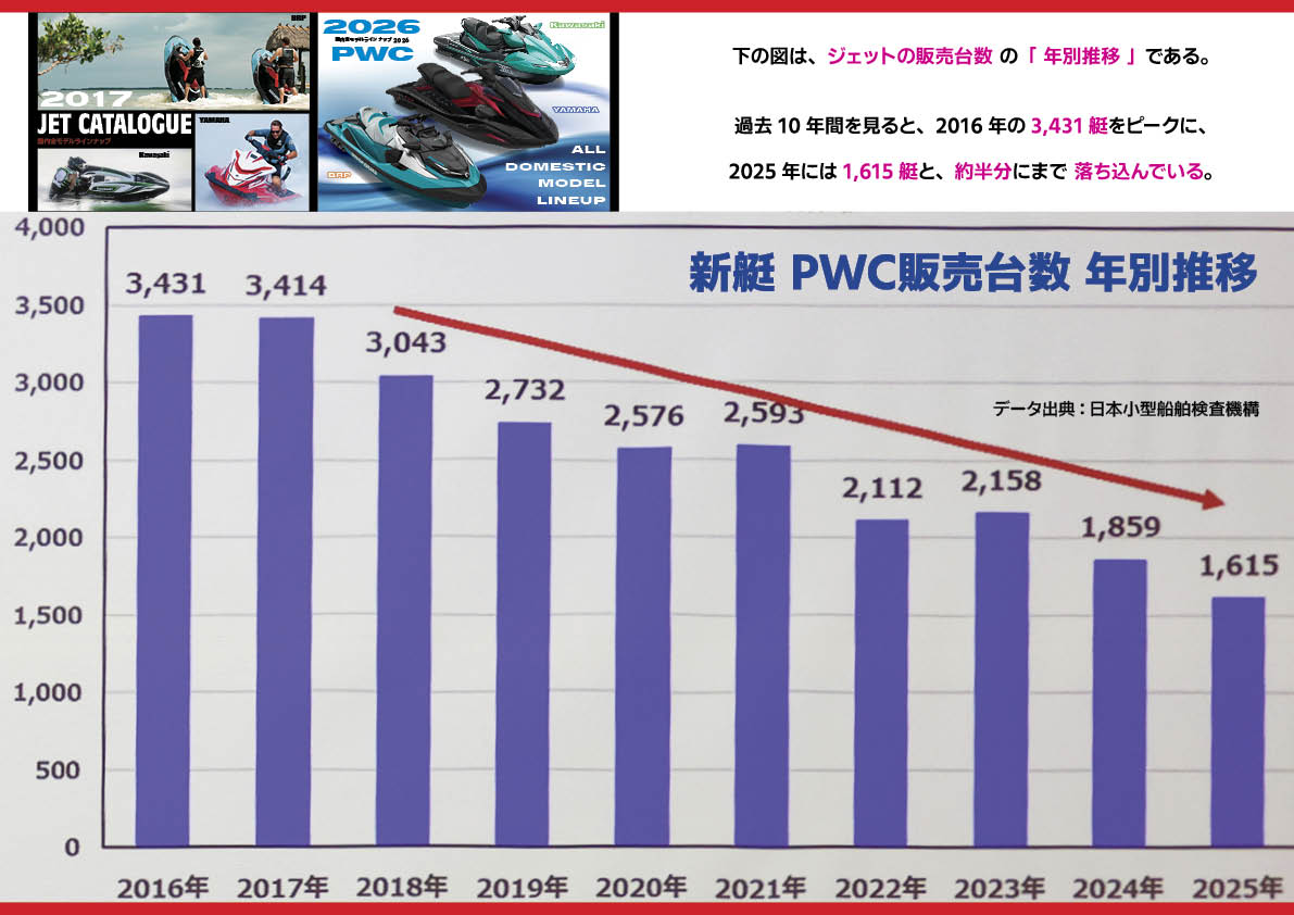 ジェットの販売台数が、10年間で 3,414艇 から「 1,816艇も減った 」ことについても 説明があった。