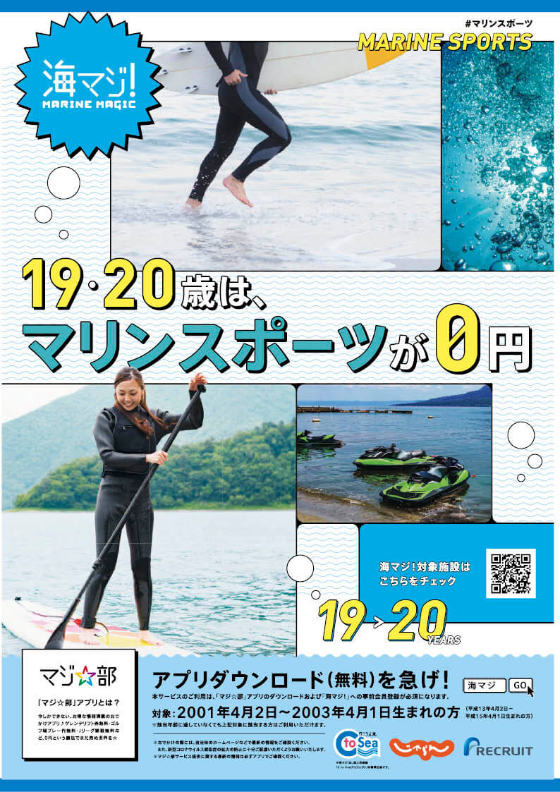 「海マジ!~MARINE MAGIC~」は、19歳~20歳世代の方を対象に全国のマリンアクティビティ体験を無料で提供しています。ジェットスキーをはじめ、クルージング、SUP、サーフィンやボディボードなどの体験などが無料になります。泳ぐだけじゃ、もったいない。眺めて、乗って、釣って、漕いで……。この機会に、海で遊ぶことの楽しさを体感してください。