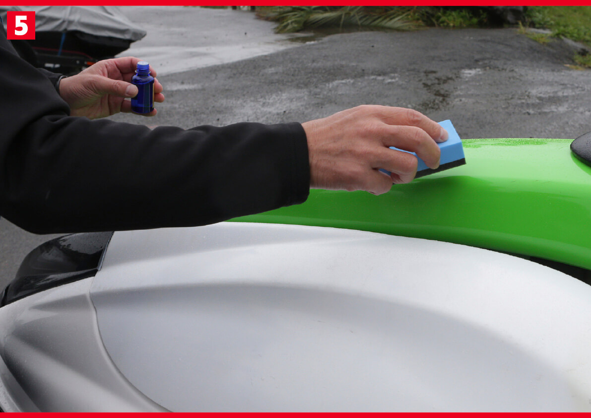 7. 溶剤をひと通り塗り終えたら、すぐに水拭きする。最初に船体の水洗いで使ったマイクロファイバータオルを洗い、硬く絞って使う。