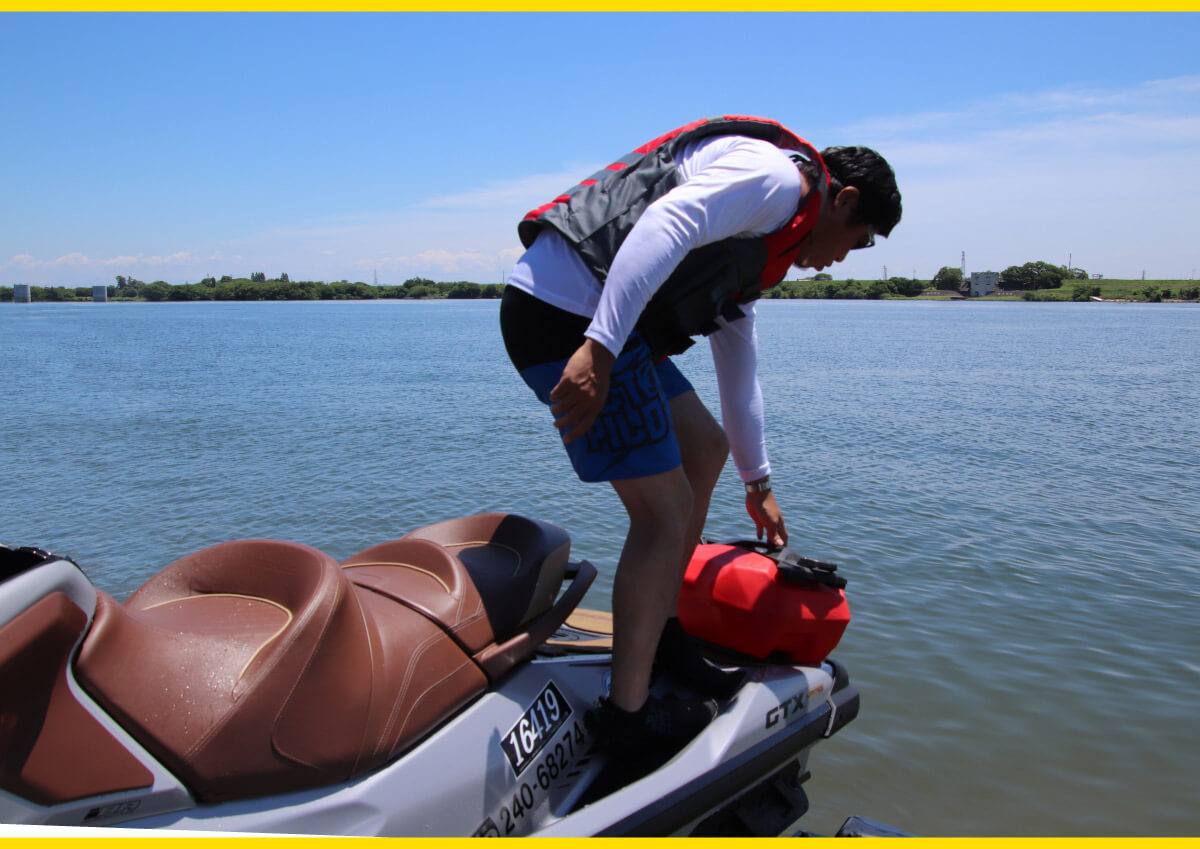 超ベテランの西本店長ですら、警告音が鳴って、「もうガソリンがカラカラ。止まる寸前でヤバかった」と思いながら、ガソリンスタンドに給油に行くと、53リットルで満タン。実は、あと7リットルも残っていたので驚いたという話を聞きました。ベテランのジェットユーザーでもそうなのだから、正確に残量が分かる人などいるはずがありません。しかし、予備のガソリンタンクがあれば、最悪、水の上でガス欠になってもそこで給油して、陸に戻ってくることができます。たった15リットルと思うかもしれませんが、60リットルで満タンになるタンクです。1/4も入ったら、かなり走れます。
