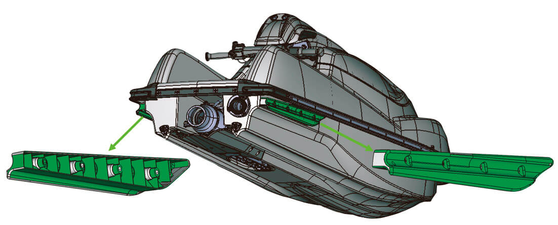 これにより、高速域やラフウォター域で発生する水しぶきを最小限に抑えてくれる。