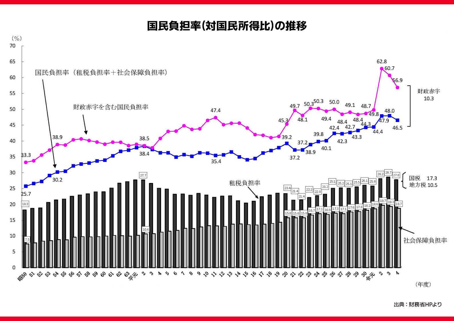 国民負担率の推移。WJS 私は「国民負担率46.5%」という数字を聞いて、「収入に対して、自分はこんなに税金を払わされているの?」と憤慨しましたが、それは的外れなことですか?