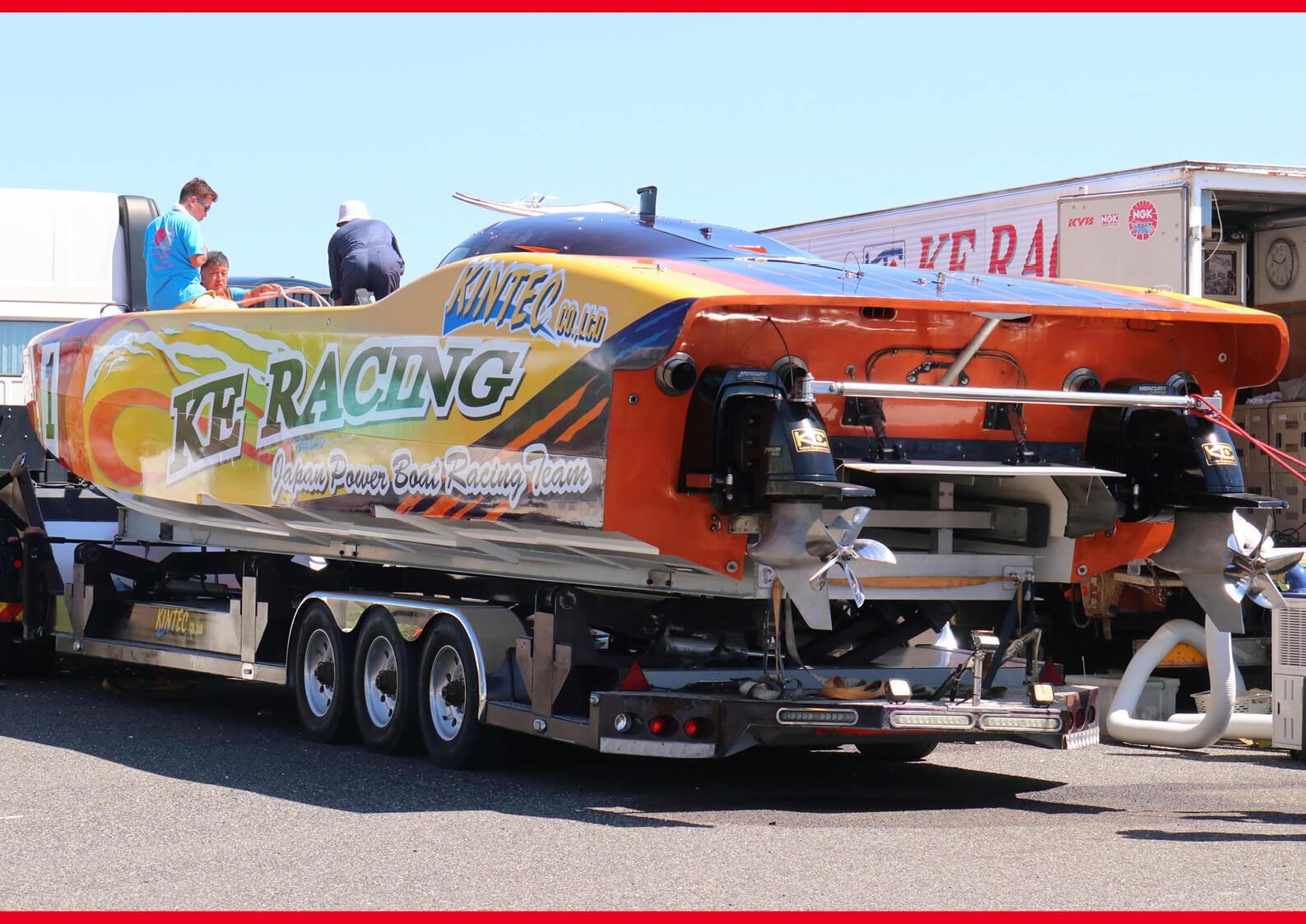 1600馬力のモンスターパワー、船内には8,200ccのエンジンが2基搭載されている「インボートタイプ」。全長約35フィート(15.24メートル)のマシンは、運ぶだけでも大変だ。