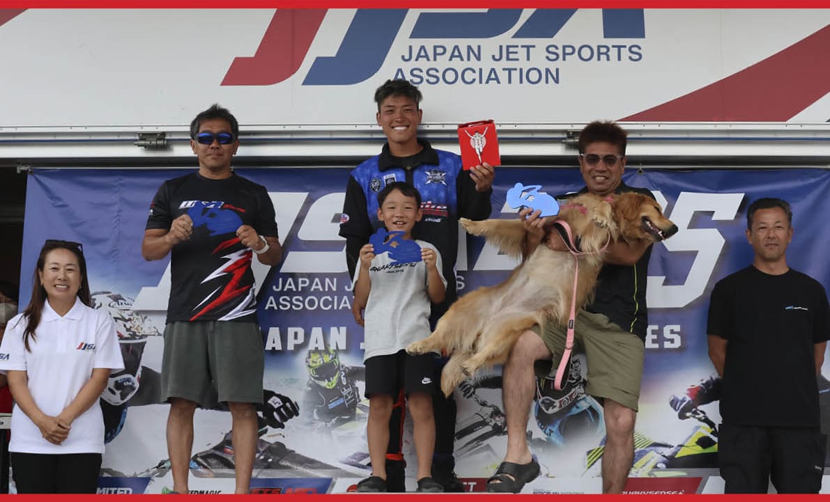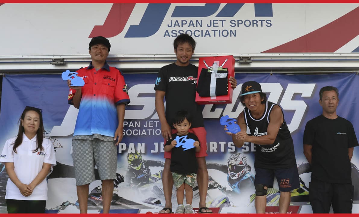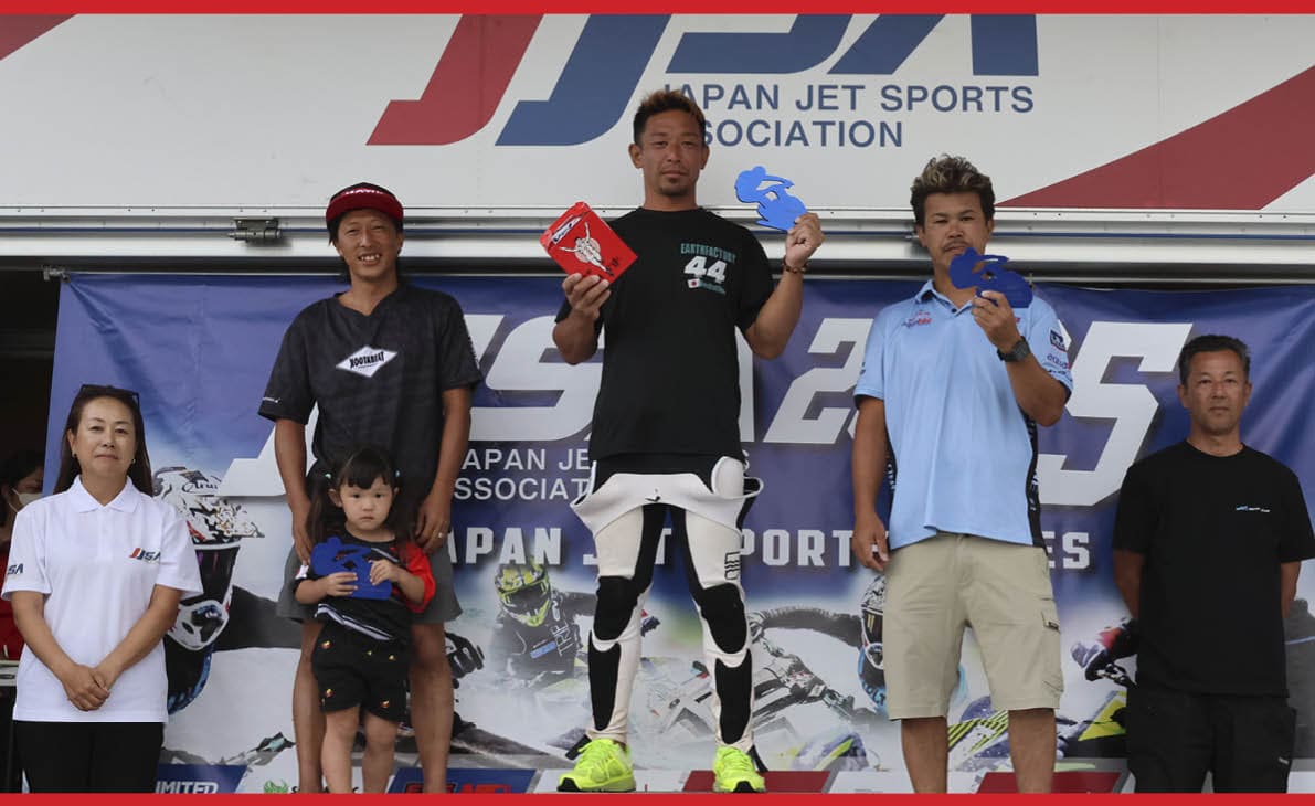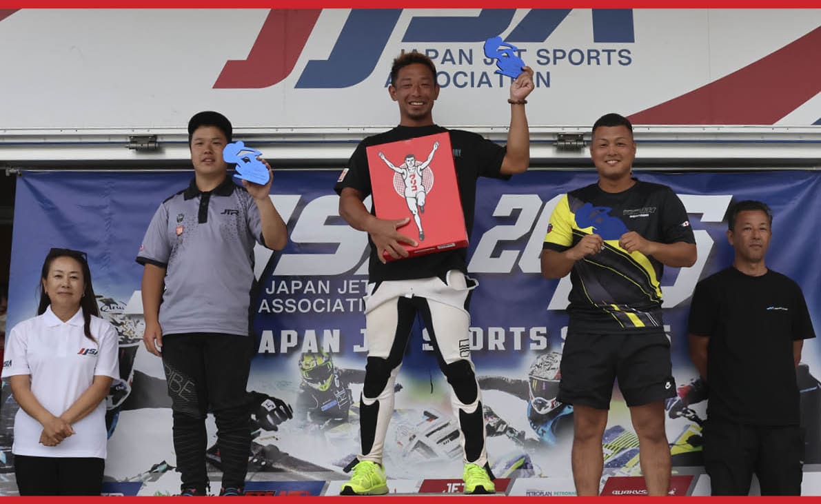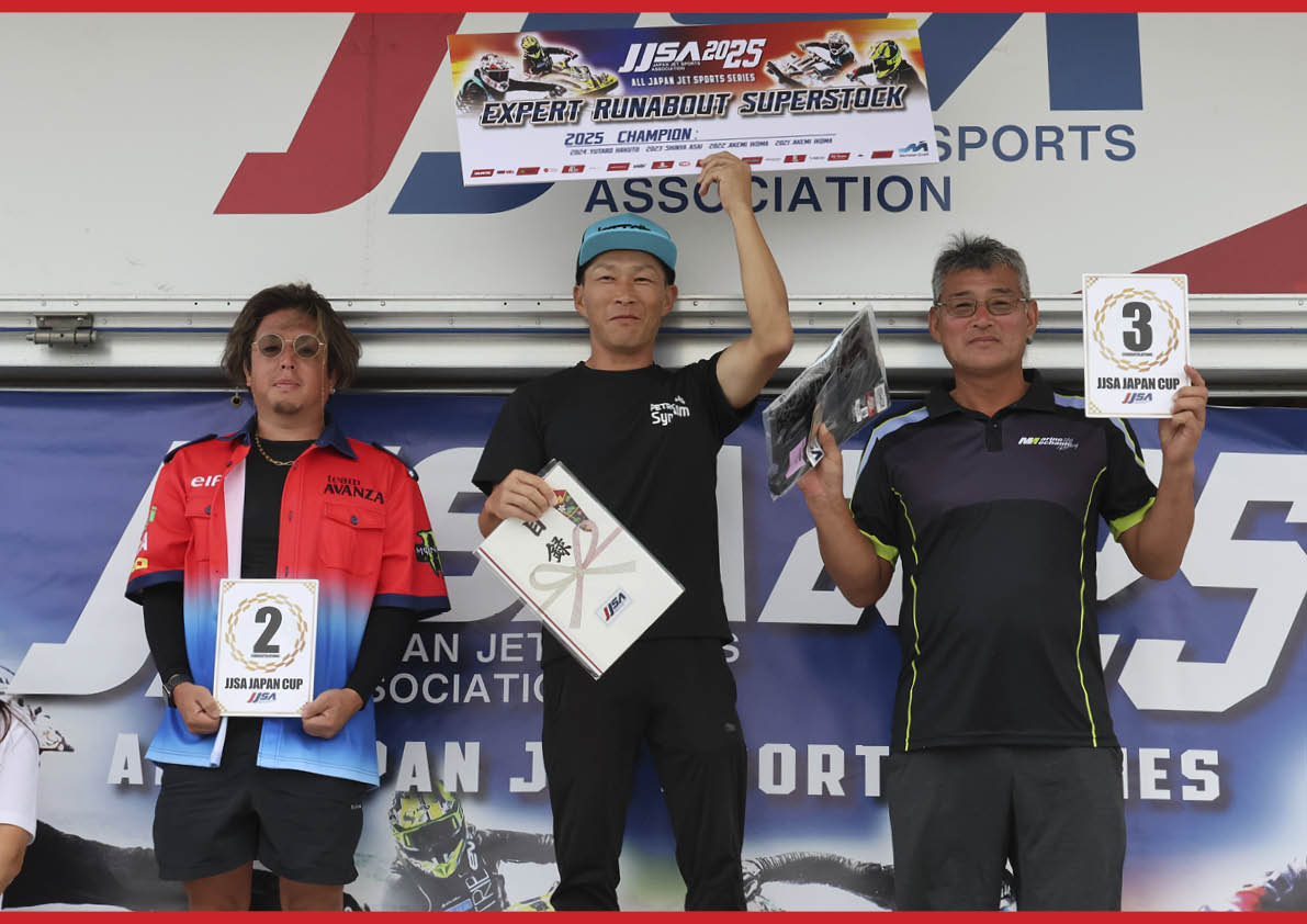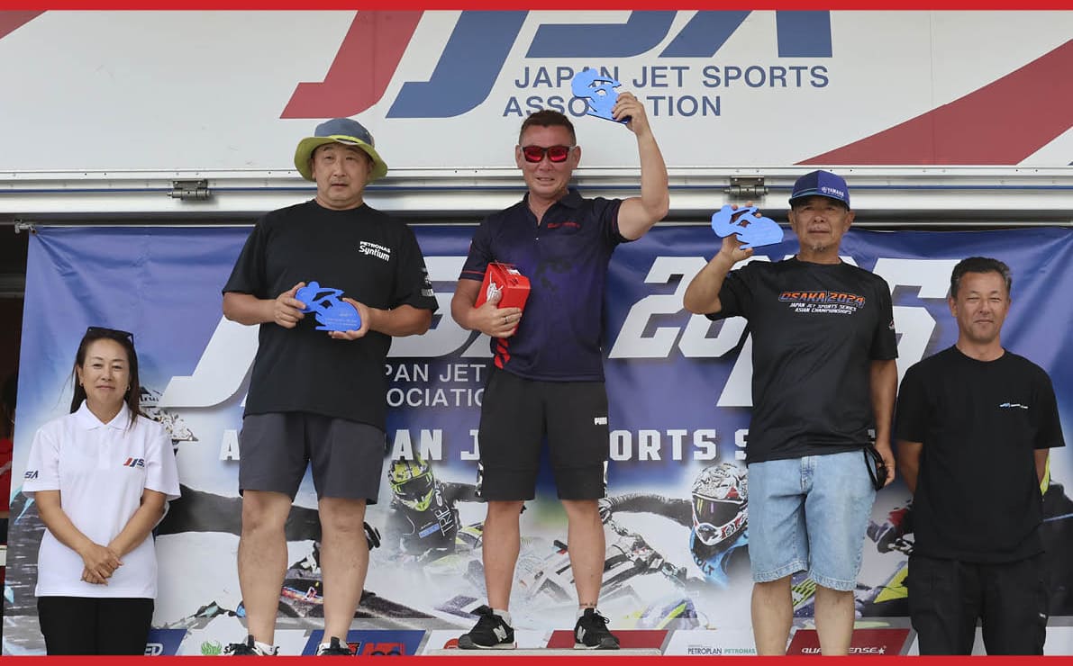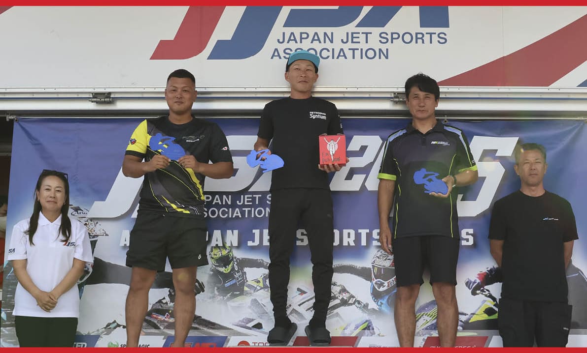 第5戦 FINAL Stage・二色の浜大会・Pro Runabout 1100 Stockクラス 表彰式。写真左から「 総合2位 林口 忠雄 選手 」、「 総合1位 片野 宣之 選手 」、「 総合3位 北澤 政幸 選手 」。