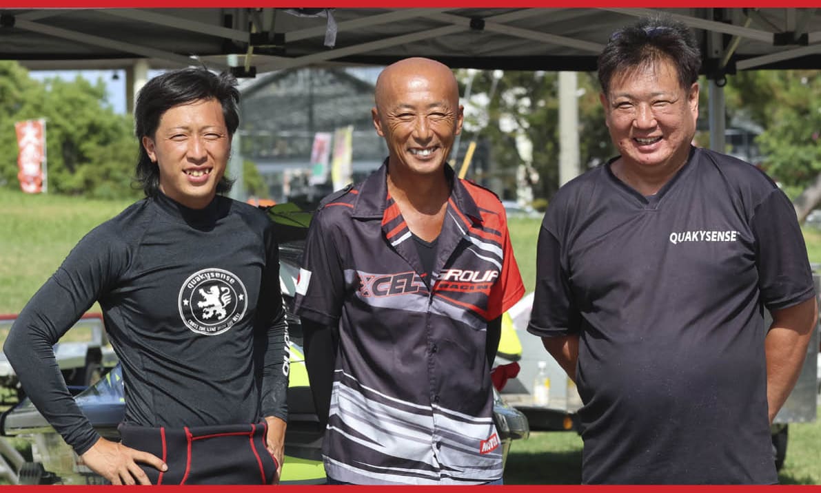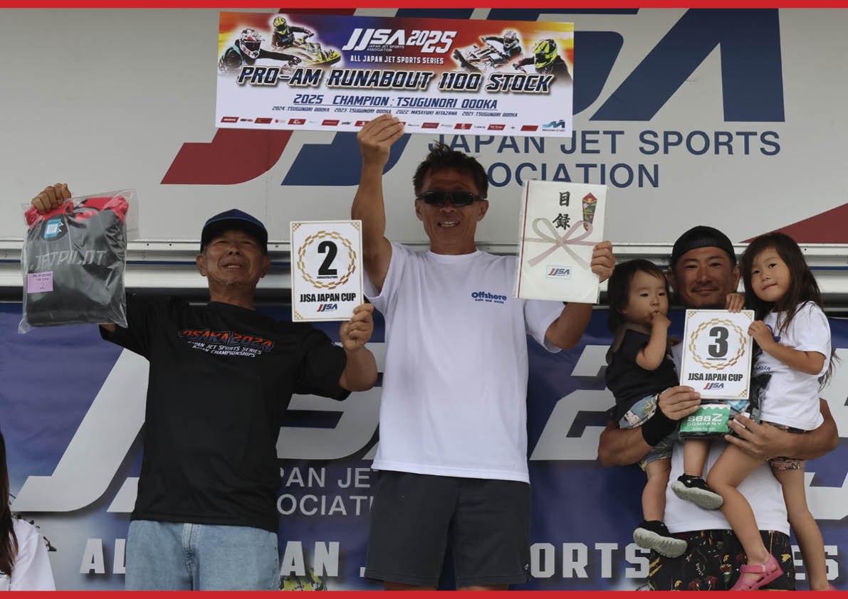 Pro-Am Runabout 1100 Stockクラス 年間ランキング・表彰式。写真左から「 総合2位 北澤 政幸 選手 」、「 総合1位 大岡 嗣典 選手 」、「 総合3位 鷹森 圭一郎 選手 」。