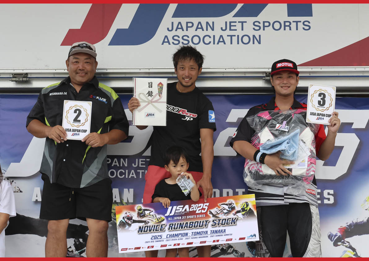 Novice Runabout Stockクラス表彰式。写真左から「 総合2位 西原 副昇 選手 」、「 総合1位 田中 智也 選手 」、「 総合3位 松田 良玖斗 選手 」。