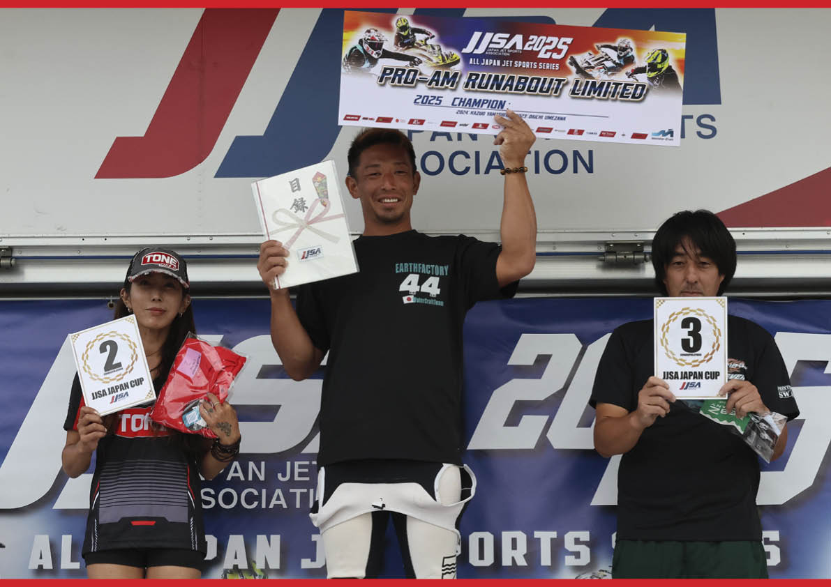 Pro-Am Runabout Limitedクラス 年間ランキング・表彰式。写真左から「 総合2位 生駒 明美 選手 」、「 総合1位 岡田 祐樹 選手 」、、「 総合3位 須藤 勇 選手 」。