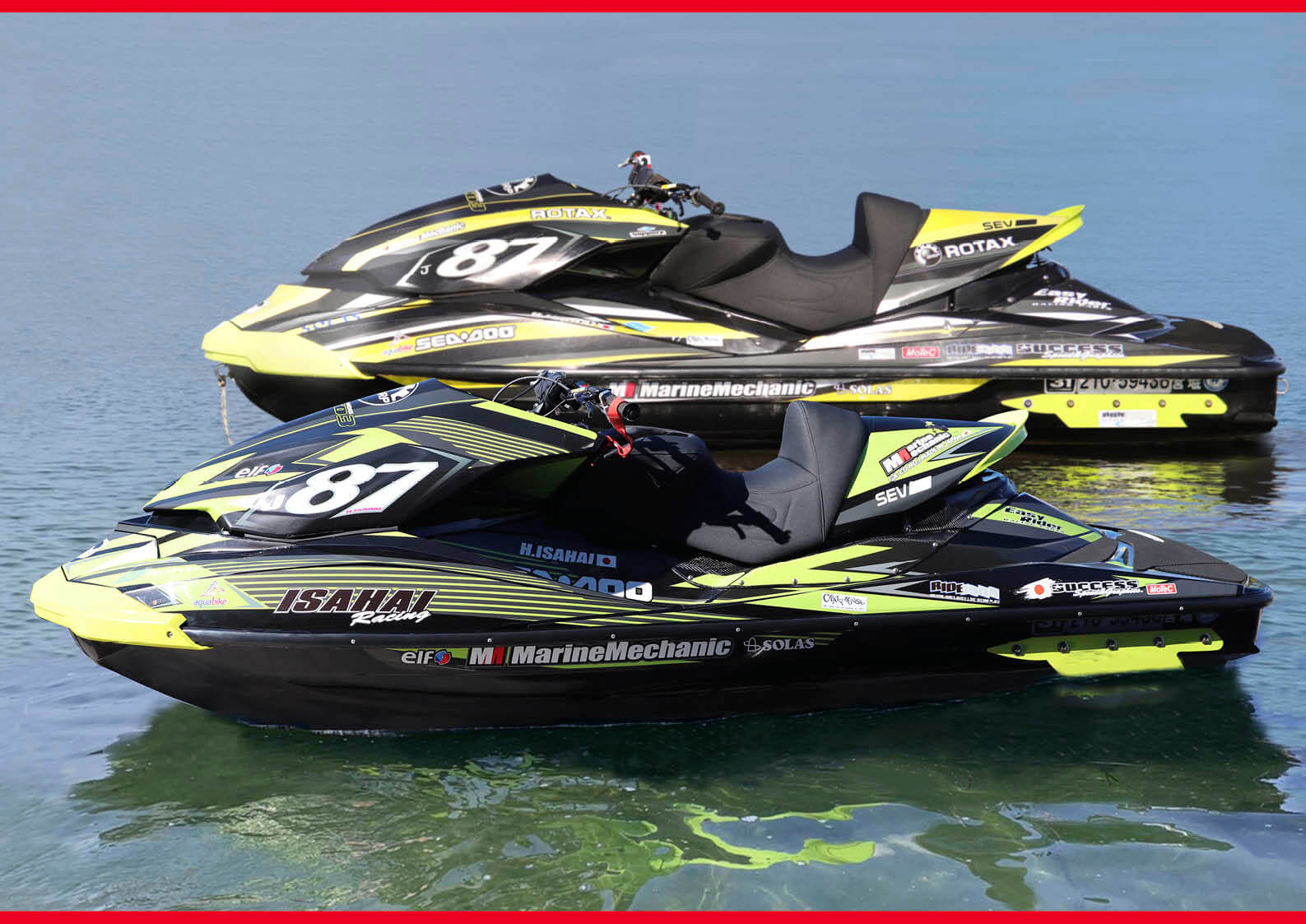 両方とも「チーム・マリンメカニックの砂盃 肇モデル」なので、ひと目で区別がつかなければならない。そのため、手を抜くことなく、毎年「カラー&デザイン」を変更している。こうして2台を並べると、その違いは一目瞭然である。